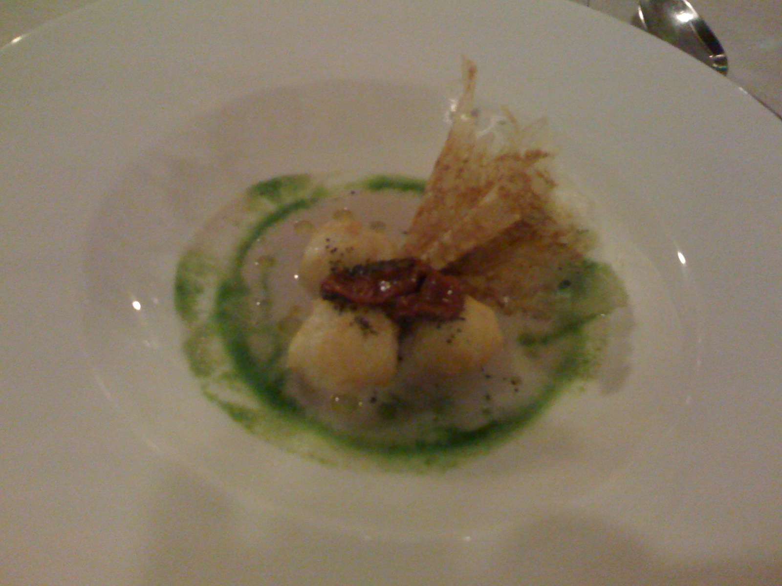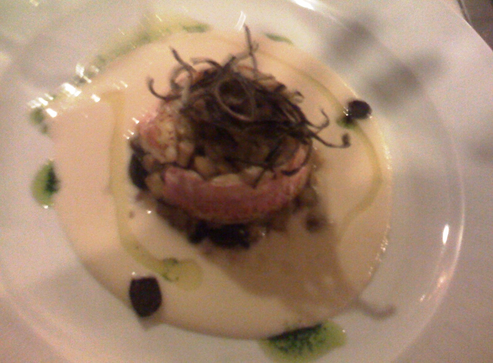 | Gnocchi di seppia con la sua salsa e centrifugato di spinaci |