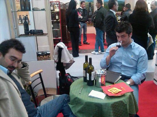 Alle 11 in punto, puntuale, ero già davanti allo stand di Bele Casel per il momento-degu programmato con le Twit-Cantine, dove ho finalmente conosciuto di persona Paolo Carlo Ghislandi di Cascina I Carpini ed ho incontrato Emiliano Pellegrino di Terre Contese (nella foto di Paolo Carlo, insieme a me) oltre che Sara Artusa, uno delle amicizie virtuali nate e cresciute su Vinix, il social-network di Filippo Ronco a cui sono iscritto da un annetto.