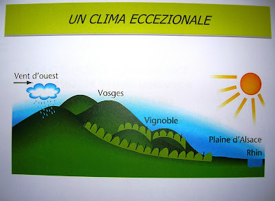 Il clima della regione è fortemente caratterizzato dalla presenza della catena montuosa dei Vosges che funge da barriera di protezione dai venti freddi e dalle piogge dell’Atlantico. La poca acqua di vegetazione e le forti escursioni termiche (l’Alsazia è la regione della Francia dove piove meno -500 mm/anno- e anche la più fredda d’inverno) favoriscono una grande concentrazione aromatica. I terreni, prevalentemente esposti a est, hanno una composizione variabile: più minerali e calcareo-marnosi ai pendii dei Vosges, calcareo-pietrosi in collina e sabbioso-argillosi in pianura.