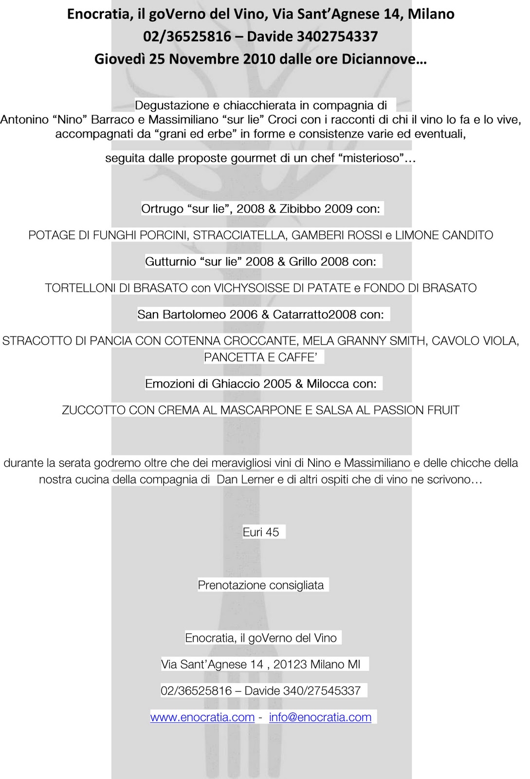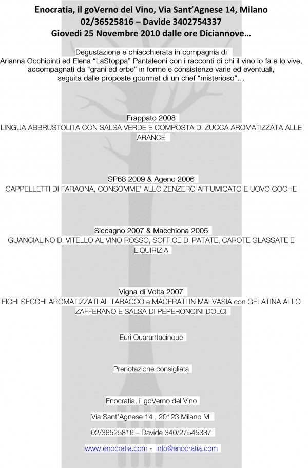 Capita assai di rado di poter cenare e scambiare quattro chiacchiere in compagnia di chi il vino lo fa. Ma udite! udite! questo vi sarà possibile da Enocratia, il goVerno del Vino, nuova meta per gli appassionati nel centro storico meneghino (via Sant’Agnese nr. 14).